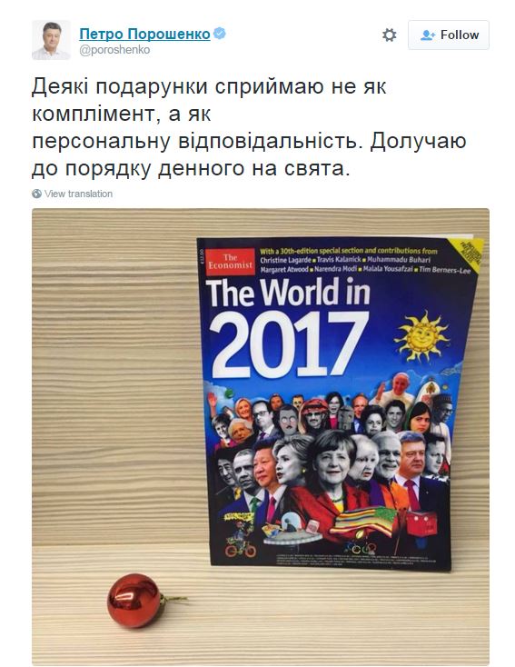 However, it later emerged that the original cover was a picture of the head of the Russian Federation Vladimir Putin and Petro Poroshenko had posted a fake picture, replacing the face of the Russian leader with his own. Moreover, The Economist has released a compilation of projections for 2016, with the Ukrainian President in 2017 being flaunted.