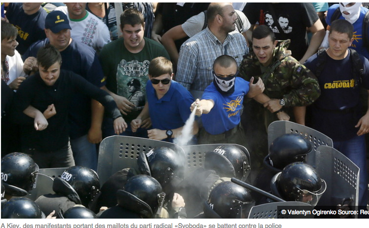 | Kiev: demonstrators wearing T-shirts of the radical Svoboda Party fight with police. |