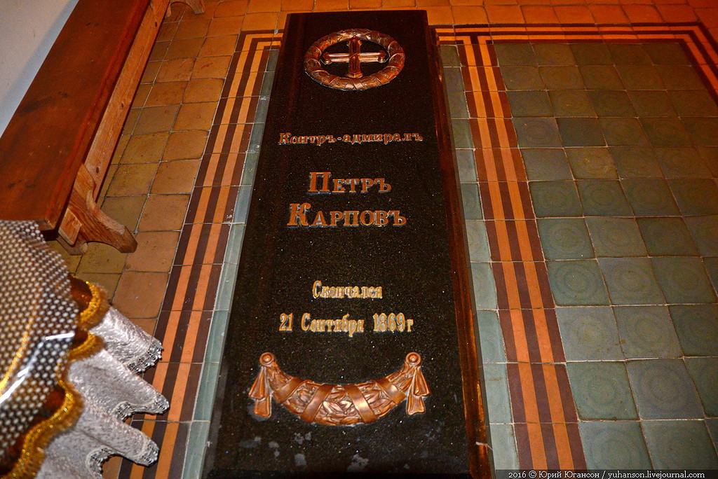 15. And on either side of the Central crypt are the other nine buried admirals who found repose in the Cathedral: P.A Pereleshin, P.A Karpov, M.I Defabr, V.P Schmidt, I.M Dikov — participants of the first defense of Sevastopol, S.P Tyrtov, G.P Chukhnin, M.P Sablin — the Black Sea fleet, I.A Shestakov — Manager of the Marine Department in the 1880’s.